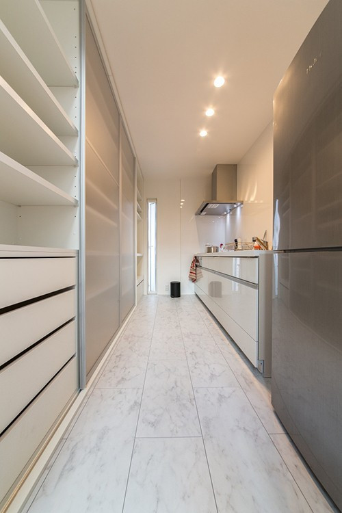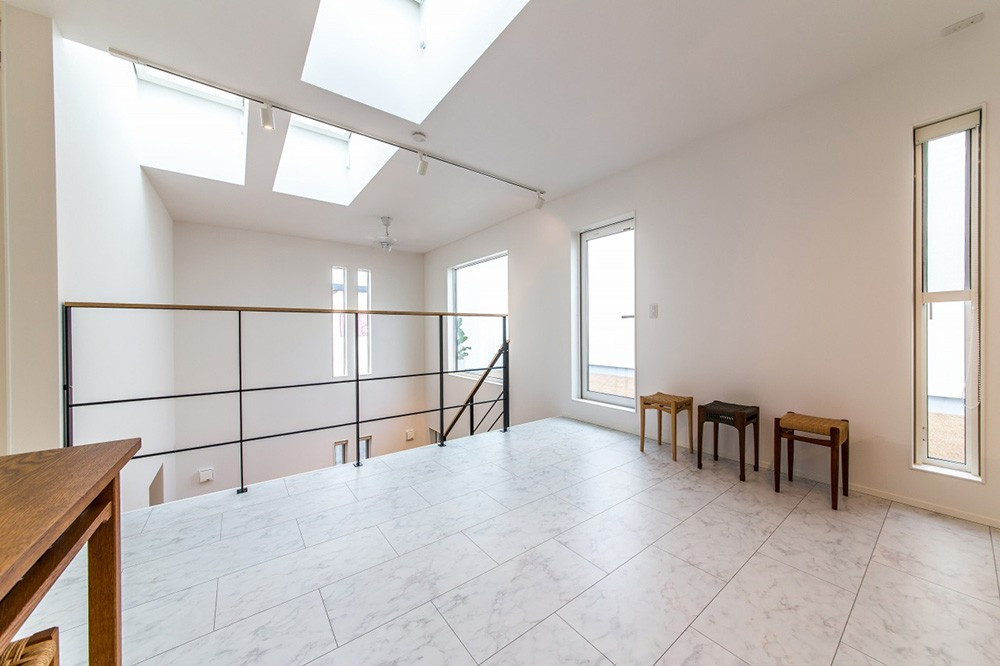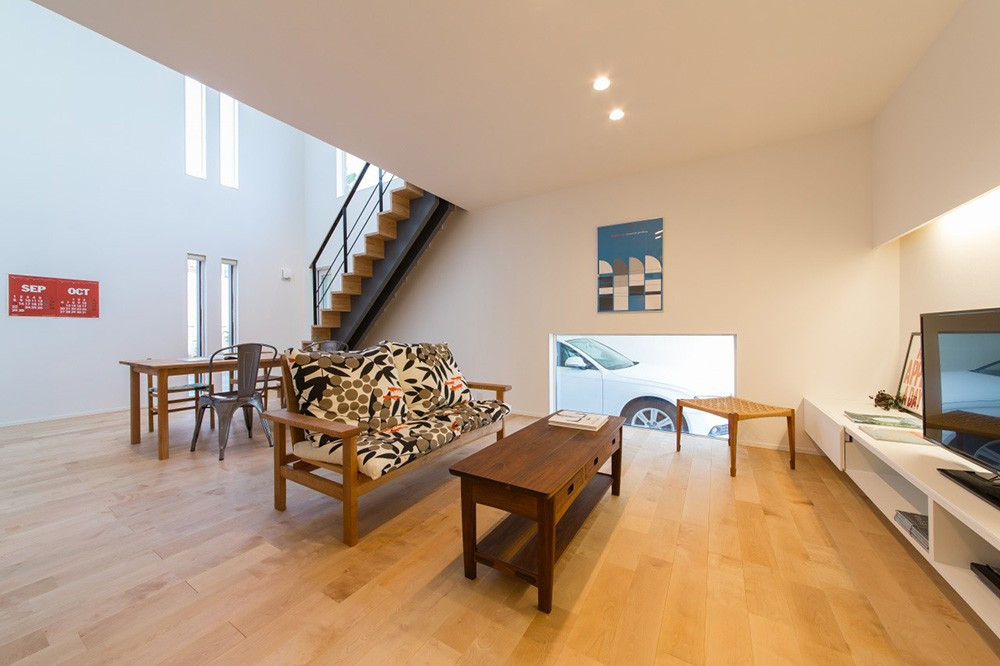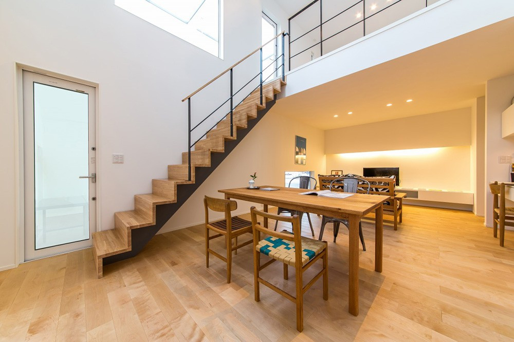 4×4の基本的な間取りに、ガレージが付いたタイプ。通用口もつくり、車から降りても雨でも濡れずに家の中に入れます。ガレージの2階部分に広々としたバルコニーを設け、1階のダイニングには、バルコニーの窓から吹き抜け越しに、光が降り注ぎます。